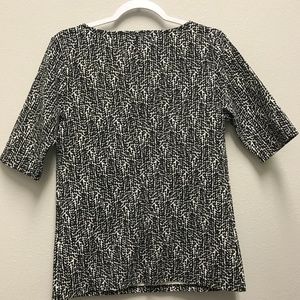 SOLD - Black and ivory top with peep hole on front of shirt. Stretchy material with longer length short sleeve. Classic and comfortable work shirt that pairs great with pretty much any look.