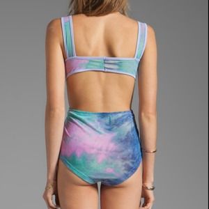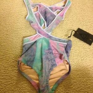 Looks amazing on. Unif shorebreak one piece. Multi tyedie print. Cross cross pattern with a high waisted style bottom. Peekaboo back.