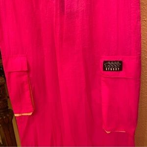 Brand New with tag. The hoodie is new without tag. Never been worn. Cool hot pink hoodie and pants set. The top has pockets on the front. The pants has pockets both sides and back. Fabric is semi-sheer. Drawstrings at the hem. Very lightweight. Comes from smoke and pet free home.