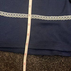 Cute retro style Dress by Fleet Collection. Features thick deep blue knit fabric, POCKETS!, and a full skirt with little white lace details. A-line / Fit & Flare mini dress style with bust darts, some stretch and lined skirt. Has hidden side zip.