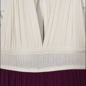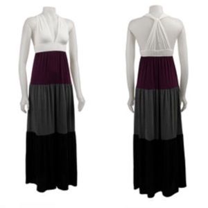 A-line maxi dress featuring ruched waist and cross-back styling. Cream colored top with plum, gray, and black skirt. Gently worn and in great condition! Fits Junior sizes 3/4 and 5/6.