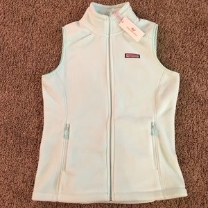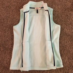 New with tags Vineyard Vines size small vest the color is called crystal blue, it's like a very light mint color. 100% polyester