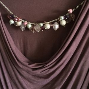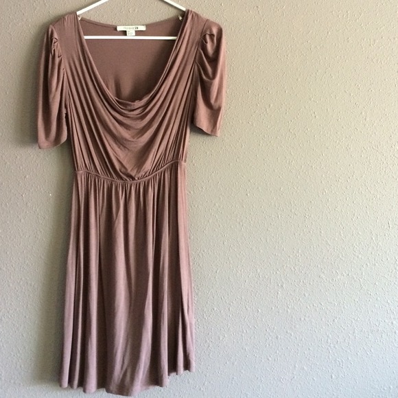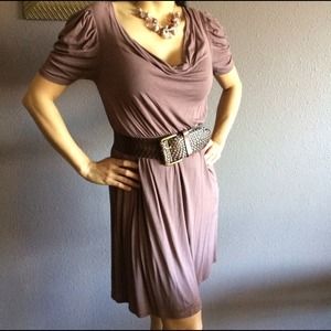 Soft Mauve-taupe color, mid-sleeve, above the knee length, low drape neckline, elastic waist, flowing bodice-skirt. Viscose-spandex blend fabric, good condition. Belt and necklace not included, only props.