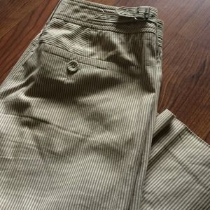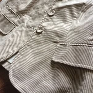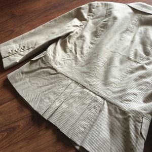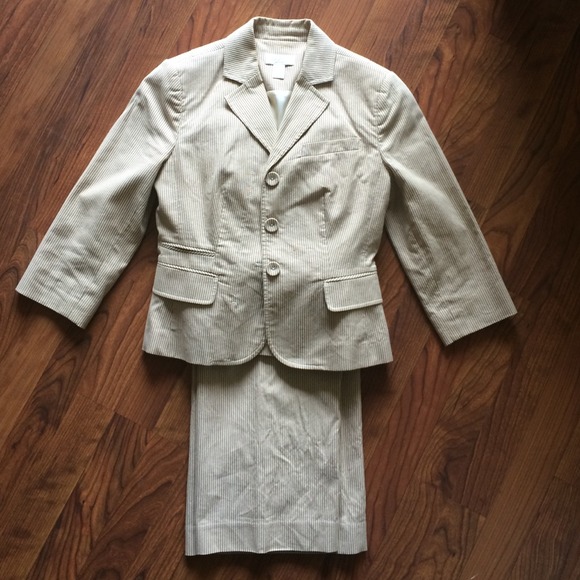 LOFT Pinstripe Suit. Jacket and pants suit. Two-tone Beige/Light Beige pinstripe. Petite Tailored-fitted. Flair bottom pants. Lined. Three button jacket with front pockets. Great condition, dry clean care. Unfortunately, doesn't fit, too small of a size for me now, otherwise I'd keep it. Very professional casual look.