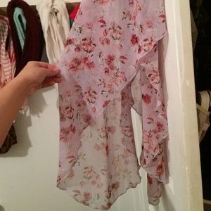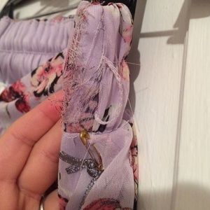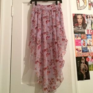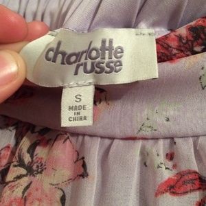 This skirt is from Charlotte Russe! It's purple with pretty pink floral print it's never been worn the only thing wrong is a slight rip in the fabric on the waist but barley noticeable. The sides are high & the middle low. Very pretty :)