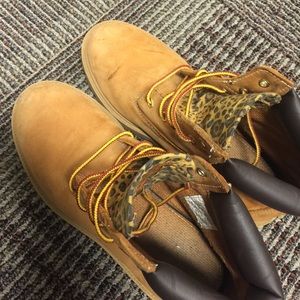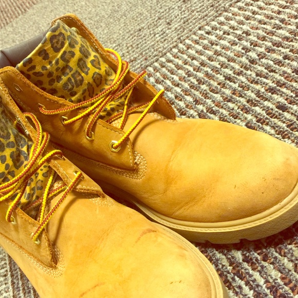 Timberlands I customized about 2 years ago ❤️ pretty worn but still have life in them , can be cleaned (not really dirty just 2 little spots that could come off) 🚐Same day shipping these are a 5.5 in boys 🚨Timberlands run big