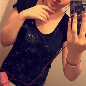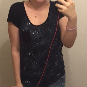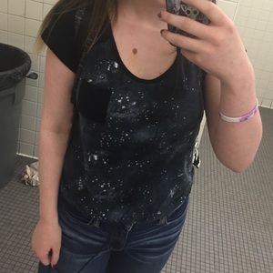 bought from Rue21 over summer but only wore for picture day at school. it is black with a dark blueish/gray Galaxy pattern all over except the sleeves and pocket are black. so cute, sad to let go. let me know if you have any questions. offers welcome. CHEAPER ON MERC. (tagged for views.)