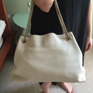 A medium sized shoulder bag with double chain shoulder straps embossed interlocking G made in light natural grain leather. Detachable tassel/Cotton Linen Lining. Worn couple of times only, in PERFECT condition no stains marks etc