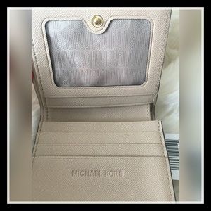 Interior features lining, 4 card slots. 2 bill compartments and one ID holder. Snap closure. Exterior features gold- tone hardware, MK logo and stitched. Cardholder: Saffiano leathers,lining, polyester. Thank you for shopping my closet💟