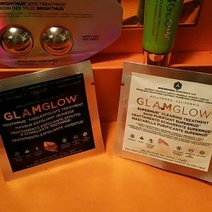IF YOU EVER WANTED TO TRY GLAM GLOW HERE IS YOUR CHANCE!!! Great product but maybe you want to try before you invest in the whole line :) 4 samples of Glam Glow products. Glam glow brightmud Eye Treatment, Glam glow power mud dual cleanse treatment, Glam glow youth mud tingle exfoliate treatment mask, Glam glow super mud clearing treatment mask.