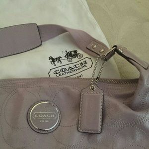 Authentic lavender Coach purse. Glossy leather for stain resistance. Measures at 14" long to 9" tall. No stains, no rips, no wear. NWOT. Comes with original duster bag.