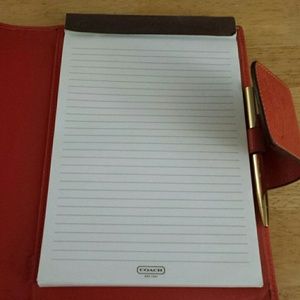 Cute Coach leather all purpose folder. Orange and pink. Opens up to 4 credit card holders, half pocket and full pocket. Other side has Coach memo note pad with pocket underneath and a golden pen with holder. Is slightly worn on some parts, but has a lot of life left to it. Pen still works.
