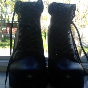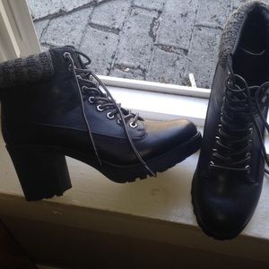 Cute black and grey boots with about two inch thick heel on the bottoms. Looks great with high waist skirts, skinny jeans & other leather items. Worn once.