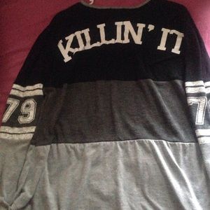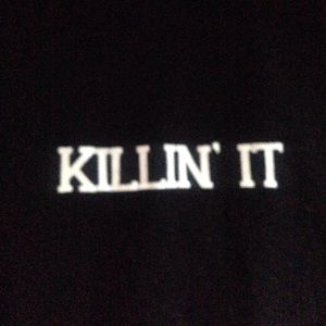 Long sleeve shirt says "killin it" on front and back. (Middle color is transparent) loose fitting shirt with lace on sleeves. (Second picture is back of shirt, third picture is front)