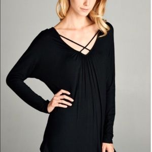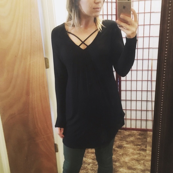Did NOT think I'd be as obsessed with this shirt as I am! Black long sleeve super comfortable top with crisscross straps in the front and a cut out back.