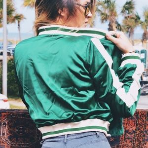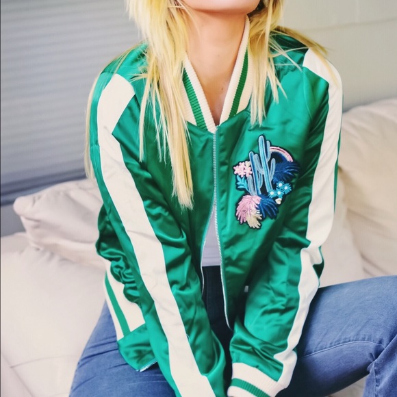 PRICE IS FIRM. Silky bomber jacket featuring contrast stripe detailing all throughout. Ribbed collar. Zip up front. Cactus patch. Perfection.