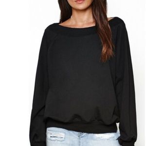 OFF SHOULDER SLOUCHY KNIT SWEATSHIRT WITH RAW EDGES.