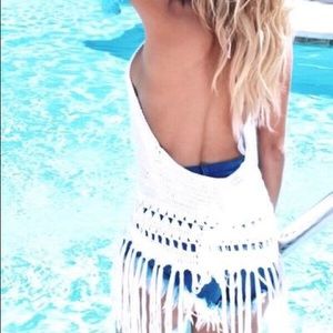 Woven crochet fringe trim halter backless boho beach cover up top. Unlined. Slouchy. FABRIC: 100% Acrylic