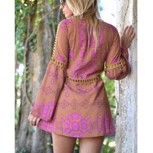 ABSTRACT PRINT BELL SLEEVES CHIFFON DRESS WITH CROCHET DETAIL FABRIC: LINING 100% POLY-RAYON RUNS SLIGHTLY SMALL UNLINED DRESS