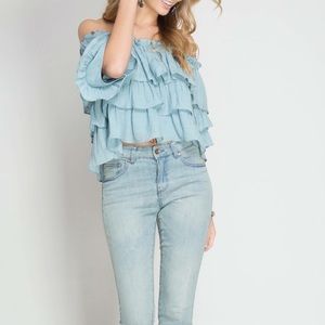 A fun & flirty off-the-shoulder halter top with all over ruffling. So light and airy. Perfect for hot summer days.