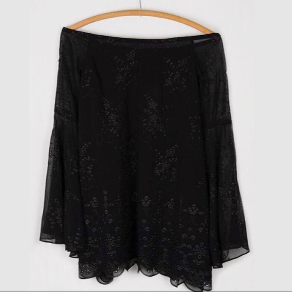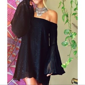 EYELET LACE OFF SHOULDER MINI. BELL SLEEVES. SCALLOPED HEMLINE.