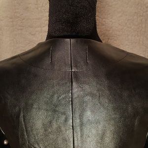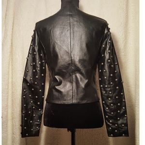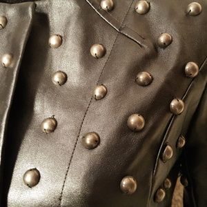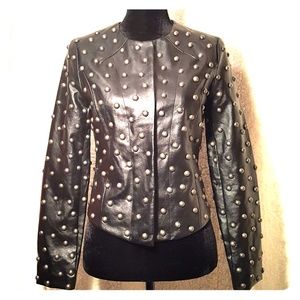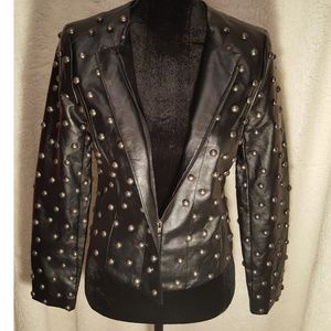 Faux Leather Jacket (not the thin pleather type) with satin inner lining and metal button/stud detail on front and arms.