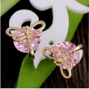 Brand new in original packaging. Gold Dragonfly Cubic Zirconia Stud Earrings. Brilliant round-cut pink topaz crystal zircon stones w. gold metal dragonfly detail. Push-backs. Material: titanium metal. Hypoallergenic. See 2nd to last pic for size reference! All sales are final, please ask all Q's prior to purchasing!