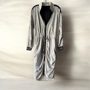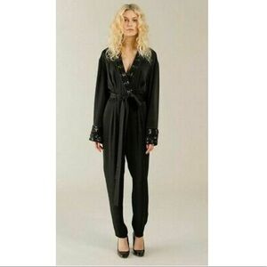 V-neck dress with full cut long sleeves. Side slit at hem. Front buttoned wrap closure.