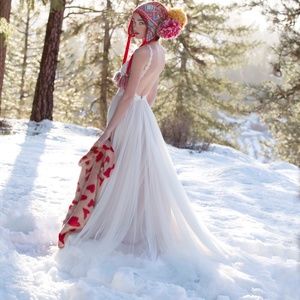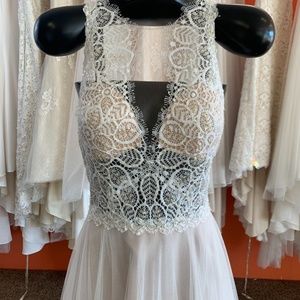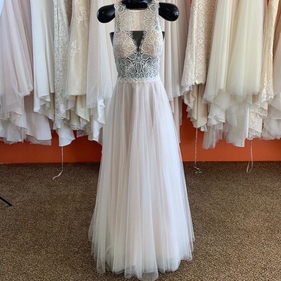 This unique gown features Doutzen lace and an illusion tulle bodice. From its high halter neck with lace details to its soft netting skirt, this is a gown that is sure to stand out.