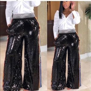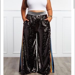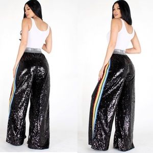 Black sequin wide leg pant elastic waist rainbow side stripe