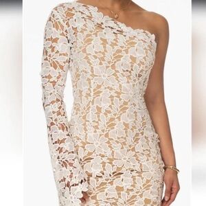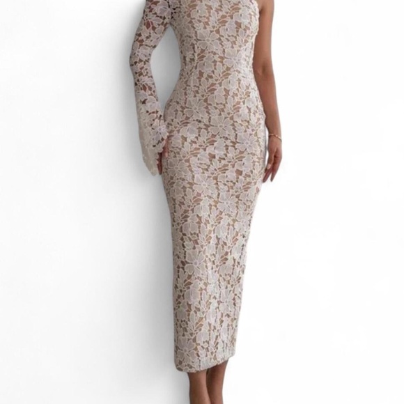 This chic one shoulder dress features a stunning white lace design, perfect for any elegant occasion. The intricate floral pattern adds a touch of sophistication.