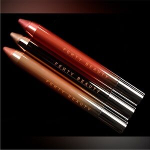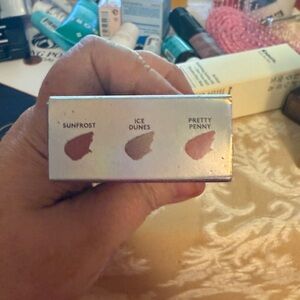 Set of three metallic lipsticks. Features vibrant red, shimmering orange, and dazzling gold shades. In shades of Sunfrost, Ice Dunes and Pretty Penny