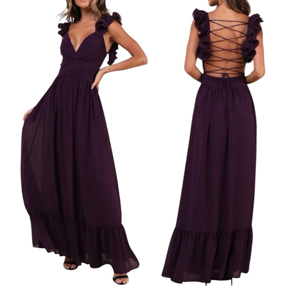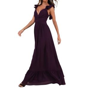 NWOT Lulus Soiree Celebration Plum Purple Ruffled Lace-Up Chiffon Maxi Gown Dress