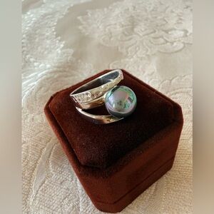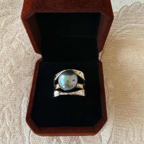 This elegant silver ring features a captivating iridescent stone, used few times with love and care , Size is 7. The brand is Majorica Spain