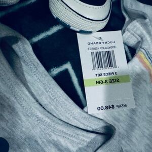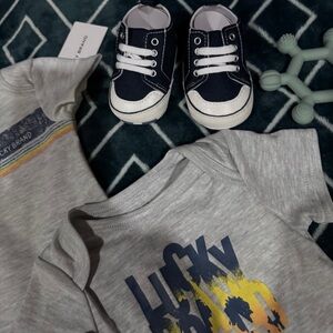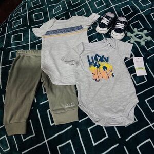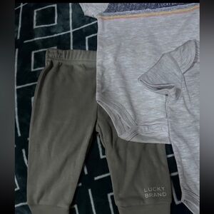 Charming baby set by Lucky Brand. Features two graphic onesies, olive pants, and stylish shoes. Ideal for a trendy baby ensemble.