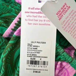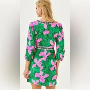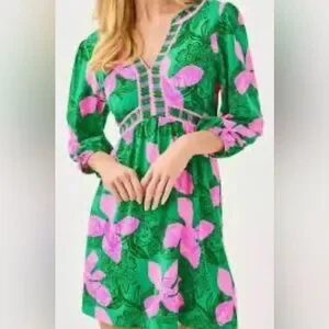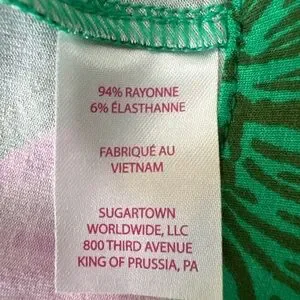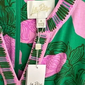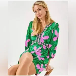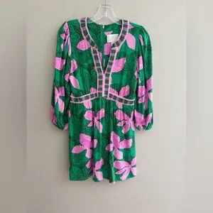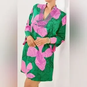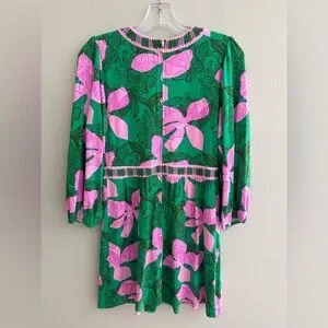 Bold green fabric with bright pink floral pattern. V-neck with contrast trim detail. Lightweight and eye-catching design.