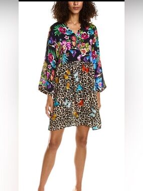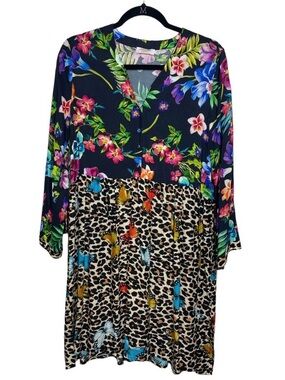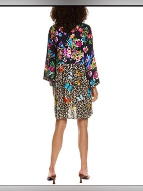 V-neck dress with bold mixed prints. Top features vibrant floral on a black background. Skirt shows leopard print with colorful butterflies. Lightweight, flowy silhouette. Eye-catching statement piece.