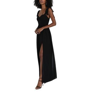This elegant black maxi dress features a flattering silhouette with stylish shoulder ties and a chic side slit. Perfect for any formal occasion.