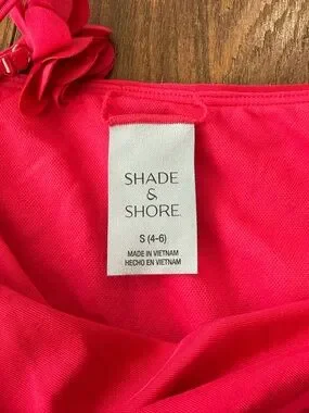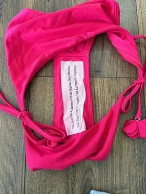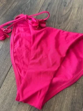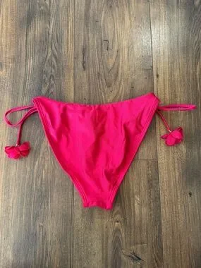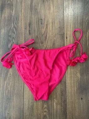 Bright hot pink bikini bottoms with tied side straps. Floral appliqué accents near the ties. Smooth, stretchy swim fabric for comfort. Flattering cheeky silhouette.