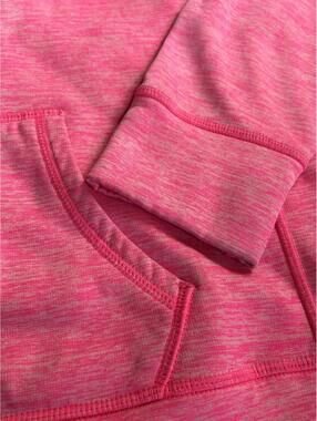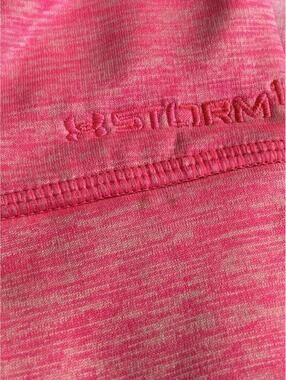 Under Armour pink hoodie with Storm technology for weather resistance. Features a large front kangaroo pocket and adjustable drawstring hood. The interior of the hood has a black and white pattern. Comfortable and stylish for casual wear or workouts.