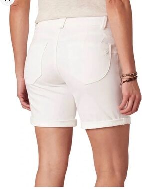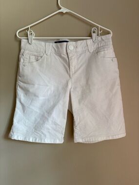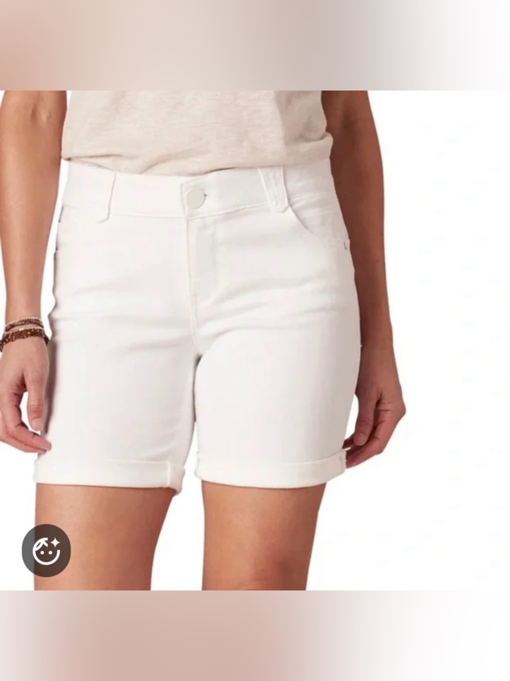 White mid-rise bermuda shorts with a clean cuffed hem. Classic five-pocket styling and a zip-fly closure. Smooth, stretchy fabric for easy movement. Versatile casual piece for warm-weather outfits.