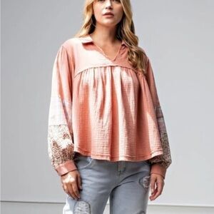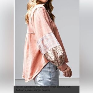 Fabric: 100% cotton, Color: rose dust, loose/ oversized style, collared, v neck placket, balloon sleeves, curved hemline