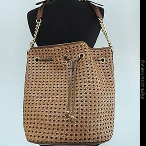 gold-tone hardware, chain link shoulder strap, interior zip pocket and top drawstring closure.