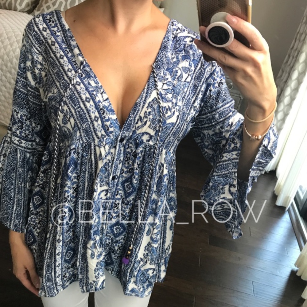 💙FEATURED HERE FIRST💙 Look like a goddess in this beautiful blue and white paisley print top. This top features a v-Neckline, bell sleeves with a Pom-Pom tassel tie. The fabric and fit is flowy and effortless. ▪️Measurements on a small: length 26”, bust 21” ▪️material: 100% rayon ▪️modeling size small (see last photo for stats) ▪️V front and back. Can adjust tassel for desired coverage. 1st photo shows it tied, 4th photo shows it untied ❌SALE PRICE FIRM. NO OFFERS❌