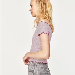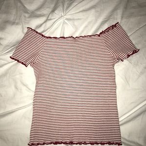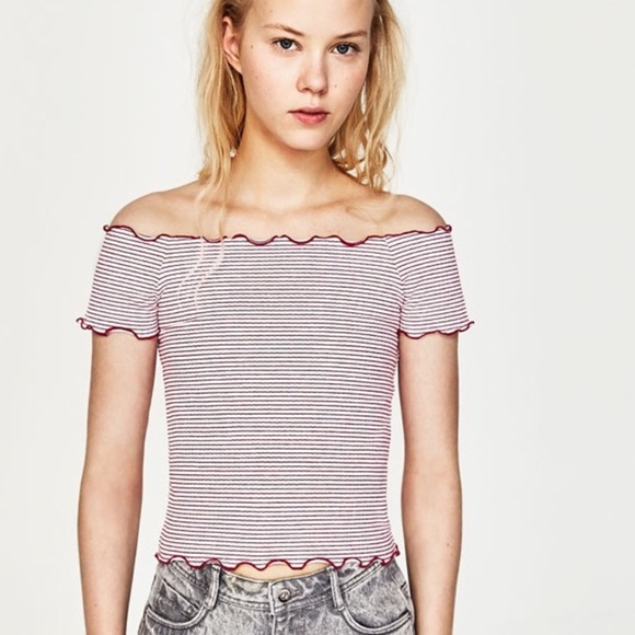 Zara off the shoulder crop top, very stretchy! It is red and white stripes with lettuce ruffles on the top and bottom. I love this shirt to death but unfortunately it no longer fits me