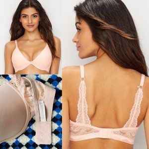 Plunge bra from On Gossamer in a pale cameo shell nude. Perfect for disappearing under low cut tops and dresses. Only worn a couple of times, excellent used condition. Runs a bit shallow because of the cut, probably better suited for a 34C or a smaller 34D.