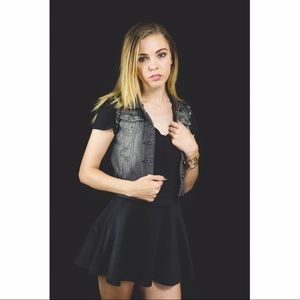 One of a kind and hand customized denim vest. Color: Grey | Size: XS | Semi-Cropped cut | Embellishments: Back panel is laced with grey fabric in a crossed design; Silver chains hang from shoulders and lay on top back panel; studs are also arranged below the chain on back top panel; 2 leather shoulder flaps that's snap closed are fashioned on to each side. 💋This is a 1 of a kind vest that I think can be paired with even the most simple outfits to give off a trendy/rocker vibe
