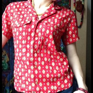 Excellent condition. No stains rips fading or holes. Really fun front flap pockets. Blue diamond country home print. Floral. Bohemian. Petite. 100% cotton. Made in the Philippines. Front panels and seams for fit. Te in the front for a rodeo. Yee haw. Cozy and comfy. Red, mellow yellow and blue. Dutch girl. Reminds me of windmills, running in flower fields and solving. Golden jingle toggle buttons.classic American. Bras A Box