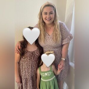 Stylish beige dress with white patterns. Features a V-neck and ruffled sleeves. 2nd photo features me wearing the dress, for reference I am 5’9”. Smoke free home