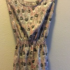 Peacock pattern. Cinched at waist, stretch. Length is to mid thigh. True to a size small.